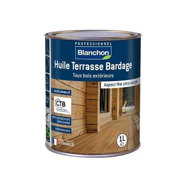 L’huile Extérieur Blanchon protège efficacement et de façon durable toutes les essences de bois : bois exotiques, feuillus, résineux, bois autoclavés et même thermotraités. D’aspect ultra mat, l'Huile Terrasse Bardage Blanchon mettra en valeur la beauté naturelle de tous vos bois. Huile transparente teintée ultra mate disponible en 4 teintes (Bois Naturel, Bois Grisé, Chêne Moyen et Ipé).