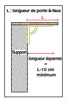 | Tout d’abord, il doit être en permanence conservé dans une pièce à l’abri du vent, de l’humidité et du froid. La température ne devra en aucun cas être inférieure à 18°C. De plus, l’humidité doit être comprise entre 45 et 65% (c’est-à-dire des conditions normales en intérieur, sauf exceptions comme par exemple un hiver très froid et donc très sec). Il doit être stocké à plat, sans contact direct avec le sol. Un panneau massif reste un produit vivant. Il est indispensable de le mettre en œuvre le plus rapidement possible après réception afin qu’il ne tuile pas. Un plan de travail ou un panneau massif doit absolument être tenu dans le sens de la largeur, soit fixé en plusieurs points dans la largeur sur les caissons de votre cuisine par exemple, soit en lui fixant des raidisseurs dans le sens de la largeur. Dans le cas d’un panneau en porte-à-faux, des équerres sont indispensables. Elles doivent être d’une longueur au minimum 10 cm inférieurs au porte-à-faux. (cf. schéma) |