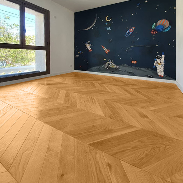 Véritable signature décorative, le parquet en chêne massif Point de Hongrie incarne l’excellence et le raffinement. Son motif iconique, composé de lames en bois massif coupées en angle et assemblées avec précision, dessine un chevron parfait qui structure l’espace et capte subtilement la lumière.