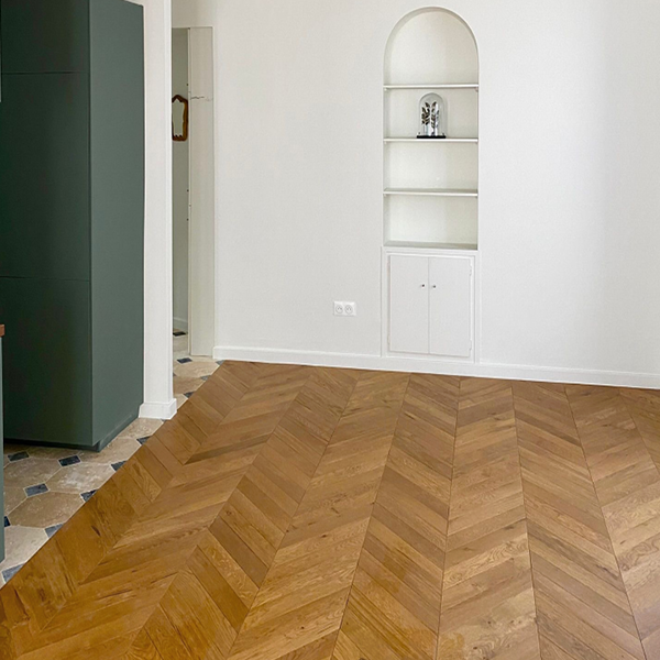 Inspiré des intérieurs haussmanniens, le parquet Point de Hongrie en bois massif traverse les tendances sans perdre de sa modernité. Il s’intègre harmonieusement dans un décor contemporain comme dans une architecture plus classique. Son motif chevron apporte rythme, profondeur et caractère, tout en sublimant les volumes et la perspective de chaque pièce.