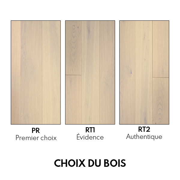 Choix RT1 - Evidence : Un parquet indémodable, agrémenté de petits noeuds qui lui conférent son côté nature et vivant. Ce parquet allie la beauté du premier choix avec quelques nœuds qui viennent apporter de la vie. C’est le choix nature par excellence.
