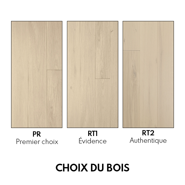 • Choix de bois : Premier choix-PR / Évidence-RT1 / Authentique-RT2
