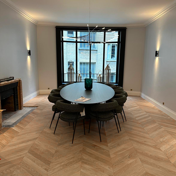 Véritable signature décorative, le parquet en chêne massif Point de Hongrie incarne l’excellence et le raffinement. Son motif iconique, composé de lames en bois massif coupées en angle et assemblées avec précision, dessine un chevron parfait qui structure l’espace et capte subtilement la lumière.