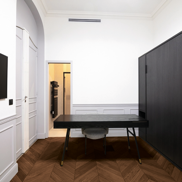 Inspiré des intérieurs haussmanniens, le parquet Point de Hongrie en bois massif traverse les tendances sans perdre de sa modernité. Il s’intègre harmonieusement dans un décor contemporain comme dans une architecture plus classique. Son motif chevron apporte rythme, profondeur et caractère, tout en sublimant les volumes et la perspective de chaque pièce.