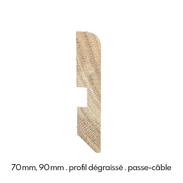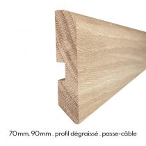Enfin vos plinthes disponibles dans les mêmes couleurs que votre parquet, toujours en chêne clair bien sûr chez nous. Vous trouverez dans la boutique les mêmes plinthes en choix PR (sans noeuds, tout petits picots tolérés d'un diamètre maximum de 8mm). Vous pouvez choisir un type de profil soit :