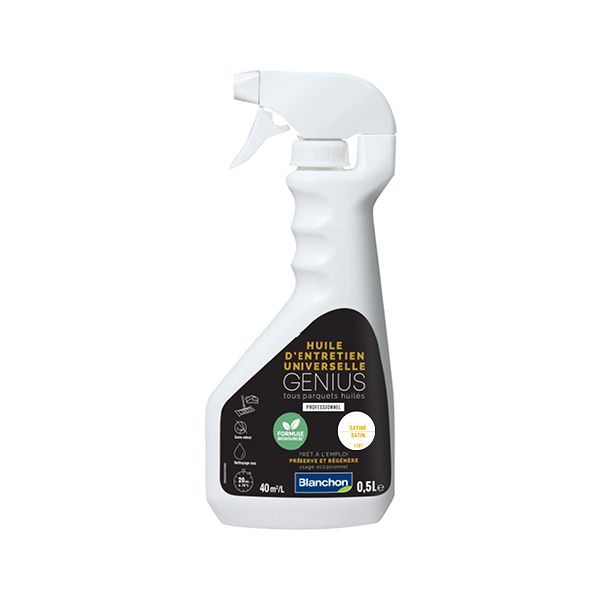 Véritable innovation technique, l’HUILE D’ENTRETIEN UNIVERSELLE SATINÉ GENIUS de Blanchon préserve et régénère tous les parquets huilés (chantiers et finis usine), quel que soit le type de finition : Huile Cire, Huile pour Parquet, Solid'Oil™, Huile Environnement (huile traditionnelle ou phase aqueuse). Elle est également parfaitement adaptée pour l’entretien des parquets huilés finis usine. Préparation du support